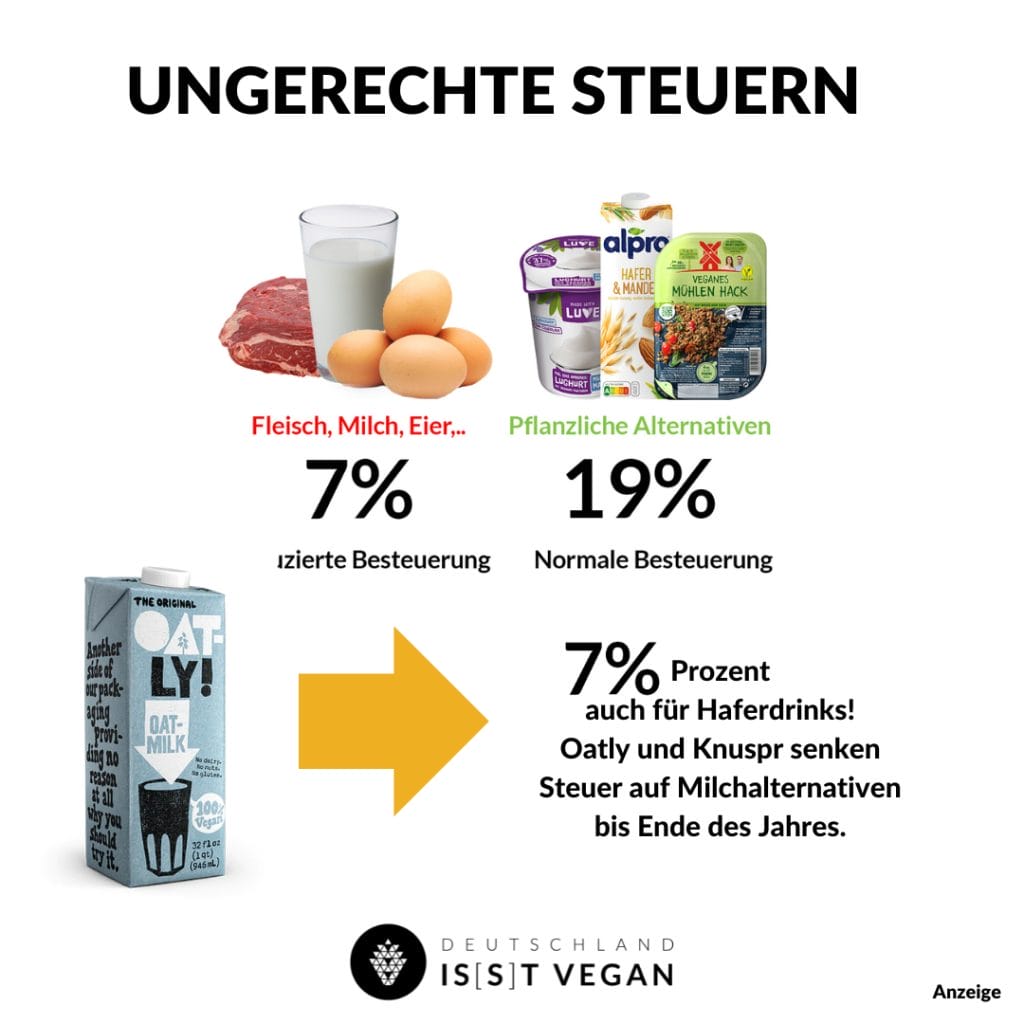 Hier in Deutschland beträgt die Mehrwertsteuer auf Kuhmilch 7 Prozent, während für pflanzliche Milchersatzprodukte wie Hafer- oder Sojamilch ein Satz von 19 Prozent gilt. Das führt dazu, dass pflanzliche Alternativen deutlich teurer sind. Viele Politiker setzen sich dafür ein, diese Ungerechtigkeit zukünftig zu beseitigen. Oatly und Knuspr schließen sich diesem Aufruf und verzichten nun bis zum Ende des Jahres auf einen Teil ihrer Gewinnmarge, um die höhere Mehrwertsteuer zu kompensieren. Wenn ihr den Code „Steuerrunter“ im Knuspr Onlineshop eingebt, wird der Preis aller Oatly-Haferdrinks um den Unterschied von 12 Prozent in der Mehrwertsteuer reduziert.