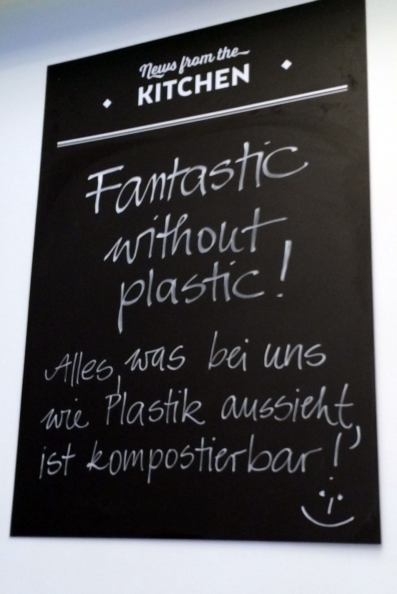 Sämtliche Verpackungen sind frei von Plastik und bestehen aus recycelten oder kompostierbaren Materialien wie Maisstärke oder Zuckerrohr. Alles, was im Lokal zurückbleit, wird der Kompostieranlage zugeführt. Auch wenn das ein Fortschritt ist und Einweg-Geschirr nun mal typisch für ein Fast-Food-Lokal ist, so finde ich diese Müllproduktion einfach völlig unnötig. Besonders hervorstechend fand ich den Service und die Freundlichkeit der MitarbeiterInnen, die selbst bei großem Ansturm schnell und gut gelaunt blieben und auch Sonderwünsche erfüllten.