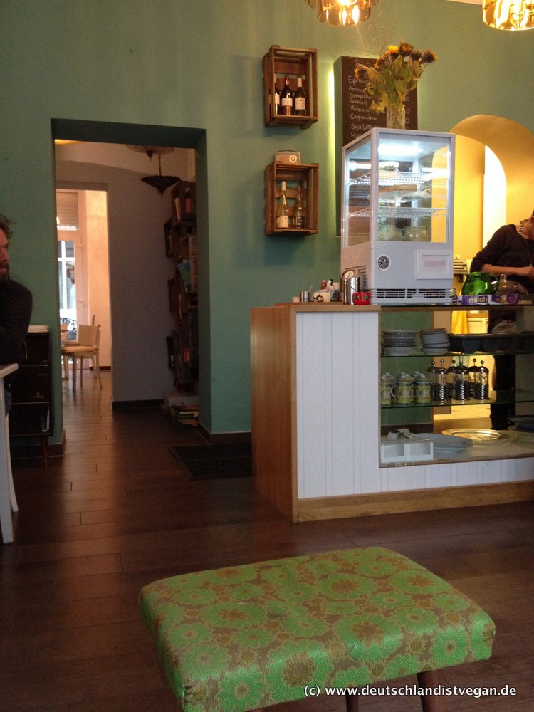 Angefangen beim liebevoll gestalteten Ambiente des recht großen Cafés mit zwei Räumen. Hier hat sich die Betreiberin und ihre Mitstreiter wirklich Mühe gegeben, man kann sich kaum satt sehen an all den tollen Ideen und Möbeln und Kleinigkeiten, die das Café zu bieten hat. Ein superschöner Mix aus vor allem 60er Jahre Möbeln und Selbstgebasteltem. Und wer dann doch genug geguckt hat, für den ist für ausreichend Lesestoff gesorgt, es gibt sogar ein Bücherregal. Ich finde das Café wirklich supergemütlich, es gibt W-Lan, und man möchte eigentlich gar nicht mehr aufstehen, sondern den Tag dort vertrödeln. Die Betreiberin und ihre Angestellten sind dazu auch noch höchst sympathisch.