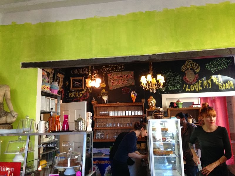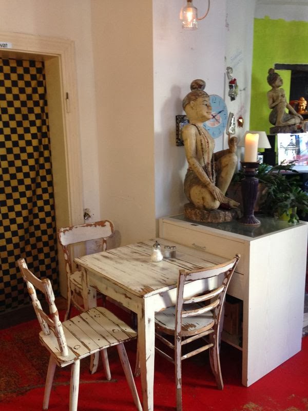 Das Café Zimt & Zucker ist absolut zuckersüß eingerichtet und man fühlt sich beim Betreten sofort pudelwohl. Es ist kein veganes Café, aber als Claudi und ich uns letztens dort getroffen haben, gab es 3 verschiedene vegane Kuchen zur Auswahl: Zwetschgenkuchen, Kirschkuchen oder Waldbeer für jeweils 2,90 €. Darüber hinaus hat es eine große Teeauswahl und die diversen Kaffeespezialitäten kann man auch mit Sojamilch bekommen.