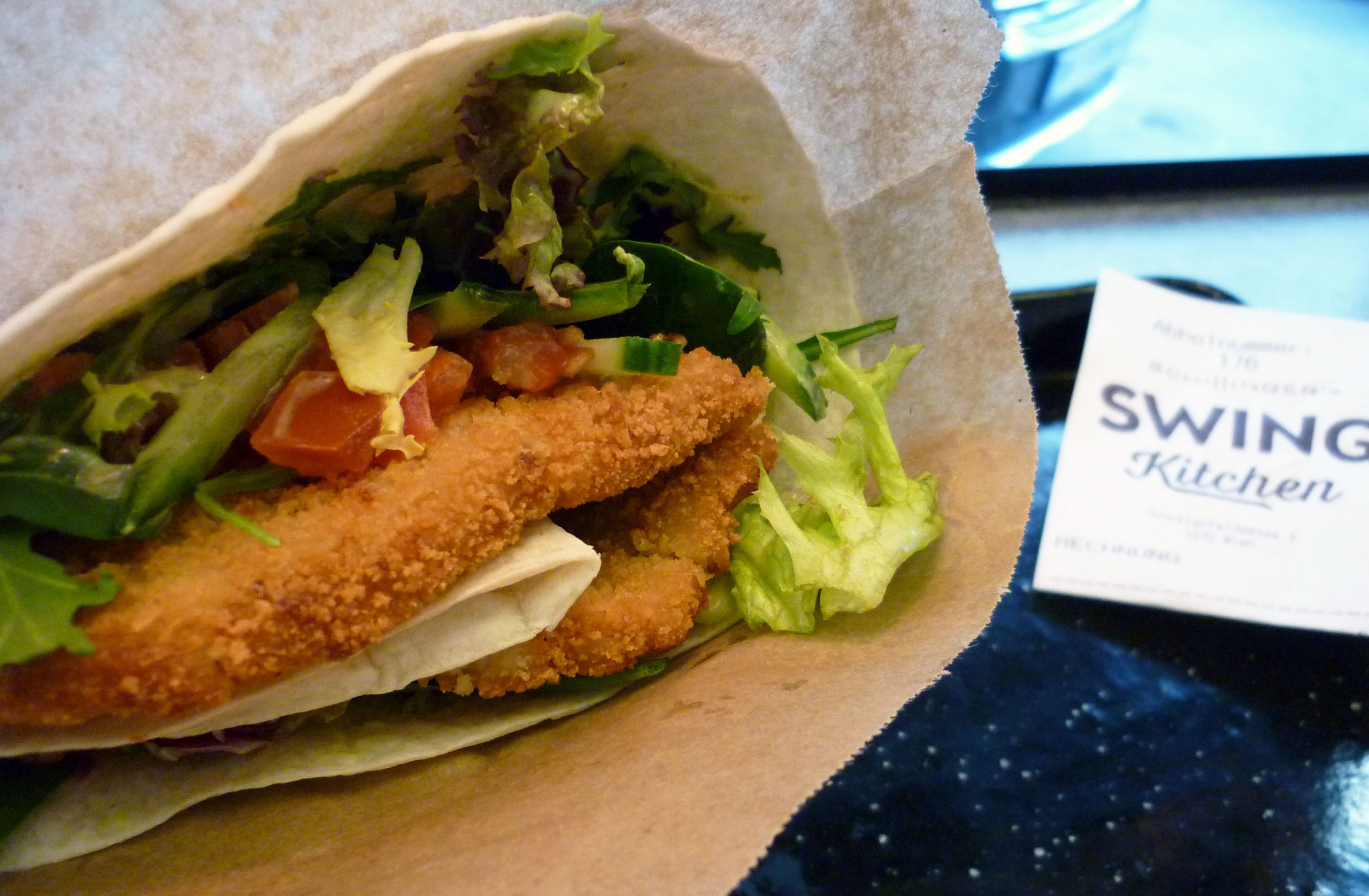 Probiert habe ich den Kitchen Wrap (das Highlight: Basilikum-Lemon-Dip!) und den Swing Burger. Beide waren satt gefüllt (zu meiner Freude auch mit verschiedenen Salaten), saftig und sehr lecker.