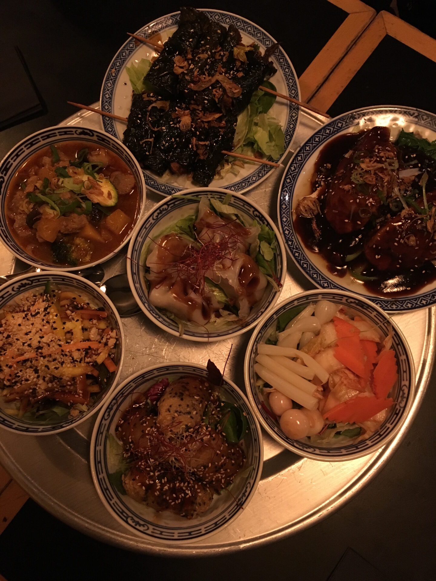 Auch das kulinarische Konzept ist ungewöhnlich. Zwar findest du ein paar wenige Hauptgerichte auf der Karte, doch richtig spannend wird es, wenn man sich gemeinsam mit den Mit-Essenden ein großes Tablett mit kleinen Gerichten, die zumeist in Schüsseln gereicht werden, zusammenstellt. Viele werden dieses System aus Spanien kennen. Dort wird auch gerne gemeinsam eine Sammlung von kleineren Gerichten geteilt, die in die Mitte des Tisches für alle verfügbar gestellt werden. Ich finde das toll, weil man so sehr viel mehr Geschmackserlebnisse erlebt, und nicht jeder einfach nur sein eigenes Gericht mampft.