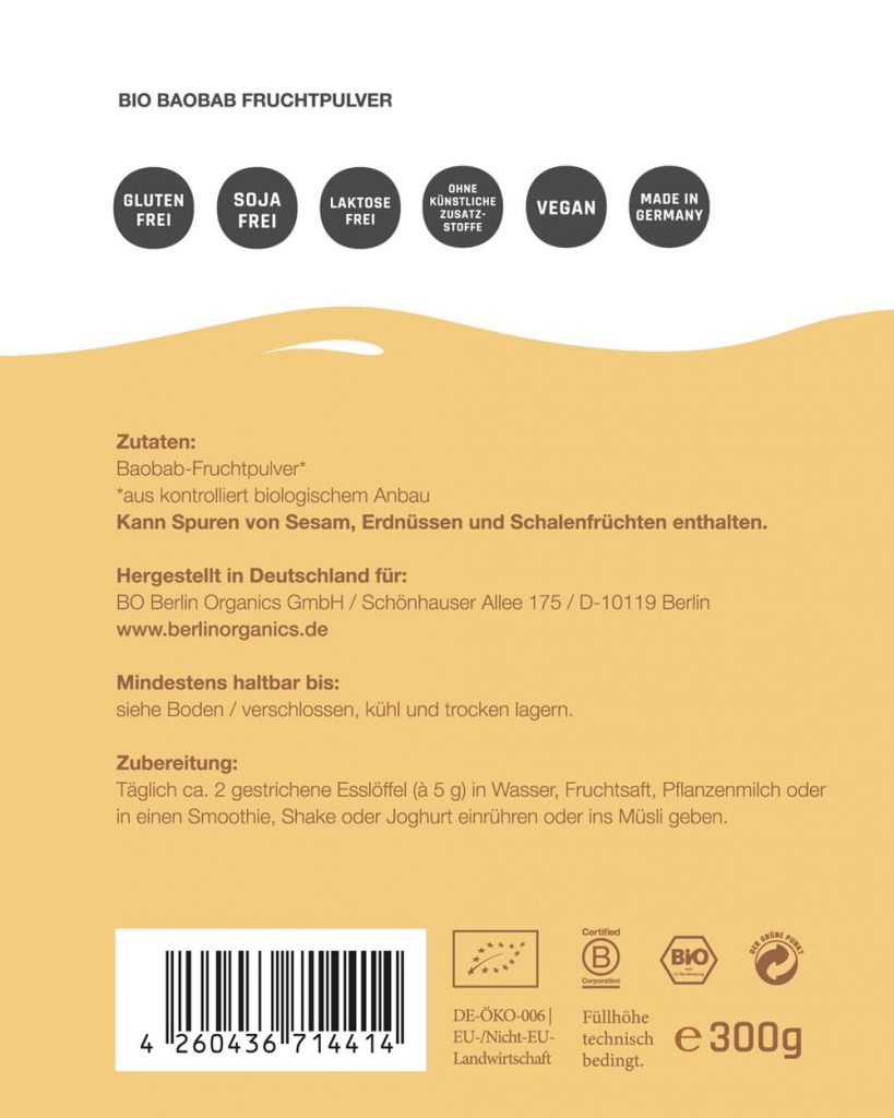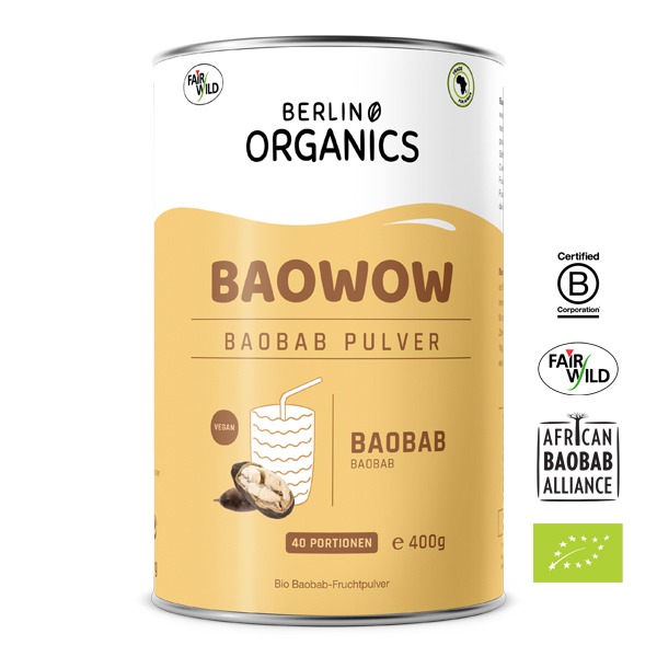 Eines ihrer Produkte ist das zertifizierte Baobab Pulver BAOWOW. Es enthält zahlreiche wichtige Nährstoffe, wie Vitamin C, Vitamine der B-Gruppe und Ballaststoffe. Von der Ernte bis hin zum Verkauf wird das Pulver schonend verarbeitet und regelmäßig auf seine Qualität überprüft. Hier kannst du dir sicher sein, ein echtes zertifiziertes Bio-Produkt in den Händen zu halten, das nicht nur dir, sondern auch der Umwelt guttut. Denn Berlin Organics arbeitet mit dem FairWild™ Lieferanten zusammen, der ein faires Arbeitsverhältnis in Afrika garantiert. Das Unternehmen unterstützt mit dem Verkauf die ländliche Bevölkerung in Simbabwe und hat die Initiative African Baobab Alliance gegründet, in der sie sich für nachhaltigen Baobab Anbau und Handel einsetzt.