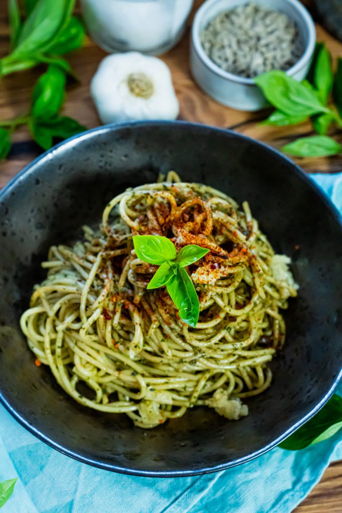 Basilikum-Pesto mit Sonnenblumenkernen -so unfassbar lecker! Dieses mediterrane Rezept ist ein wahrer Gaumenschmaus. Und weil das Thema Knoblauch bei Kindern nicht immer einfach ist, haben wir uns dieses Mal etwas ganz pragmatisches überlegt. So kann jeder mitessen und dieses Gericht genießen.