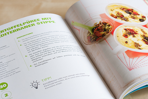 Da ich Kartoffeln so liebe habe ich gleich das „Kartoffelpüree mit mediterraner Stippe“ zubereitet. Mein Foto ist allerdings so viel schlechter geworden als jenes aus dem Buch, dass ich mich schäme, es hier zu veröffentlichen. Dafür gibt es ein paar Impressionen aus dem Rezepteteil – viel besser.