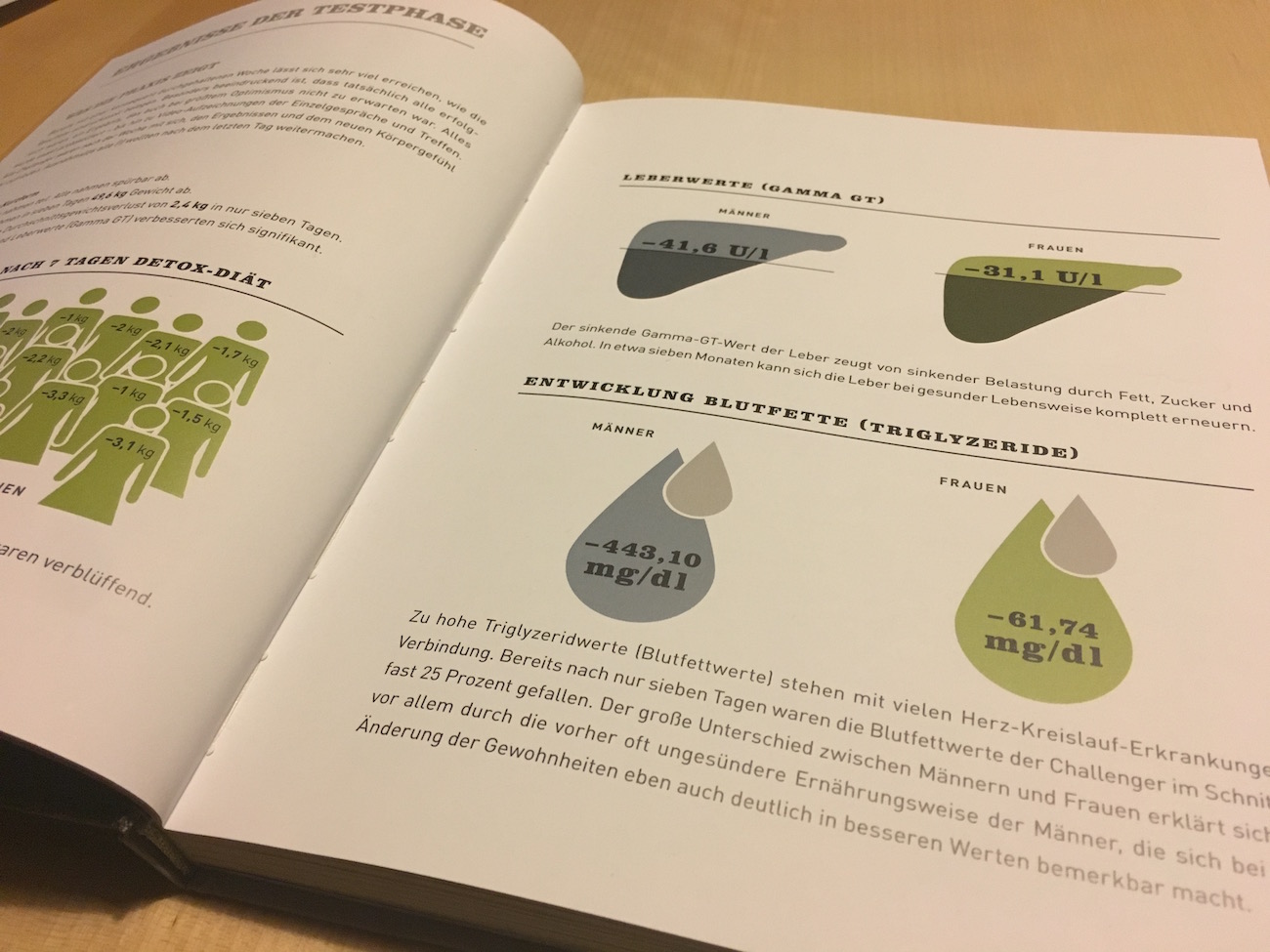 Im Anschluss an die einführenden Worte und „Grundregeln“ wird über die Testgruppe berichtet, die das Konzept im Vorfeld ausprobiert hat – mit durchaus beeindruckenden Ergebnissen. Anschließend gibt es noch ein paar To-Do-Listen für den Start, bevor es Rezepte für 7 Tage gibt, in unterschiedlichen Varianten, so dass man etwas Abwechslung reinbekommt, sollte man die 7 Tage verlängern. Morgens gibt es die Wahl zwischen 2 proteinhaltigen Shakes, mittags und abends dann die Wahl aus je 2 Gerichten, immer mit Kalorienangaben. Anschließend widmet sich Attila dem Thema „Trinken“ noch ein wenig ausführlicher, bevor es in den Fitnessteil geht. Hier bekommt der Leser insgesamt 27 Übungen erklärt, die man kombinieren kann. Abschließend gibt es noch Tipps zur Meditation und kurz knapp die wichtigsten Gründe für eine vegane Ernährung noch einmal zusammengefasst.