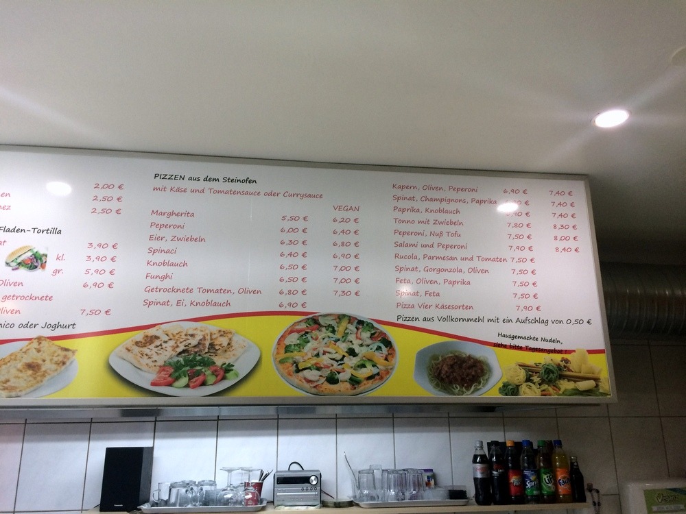 Auffällig ist auch, wie authentisch-freundlich der Service hier ist. Pizzabäcker Sali lebt selber nicht vegan, hat sich aber mit großem Eifer ins Thema gestürzt, und das Ergebnis kann sich echt sehen lassen! Die Pizzen bewegen sich übrigens im Preisrahmen zwischen 6,20 Euro und 8,40 Euro.