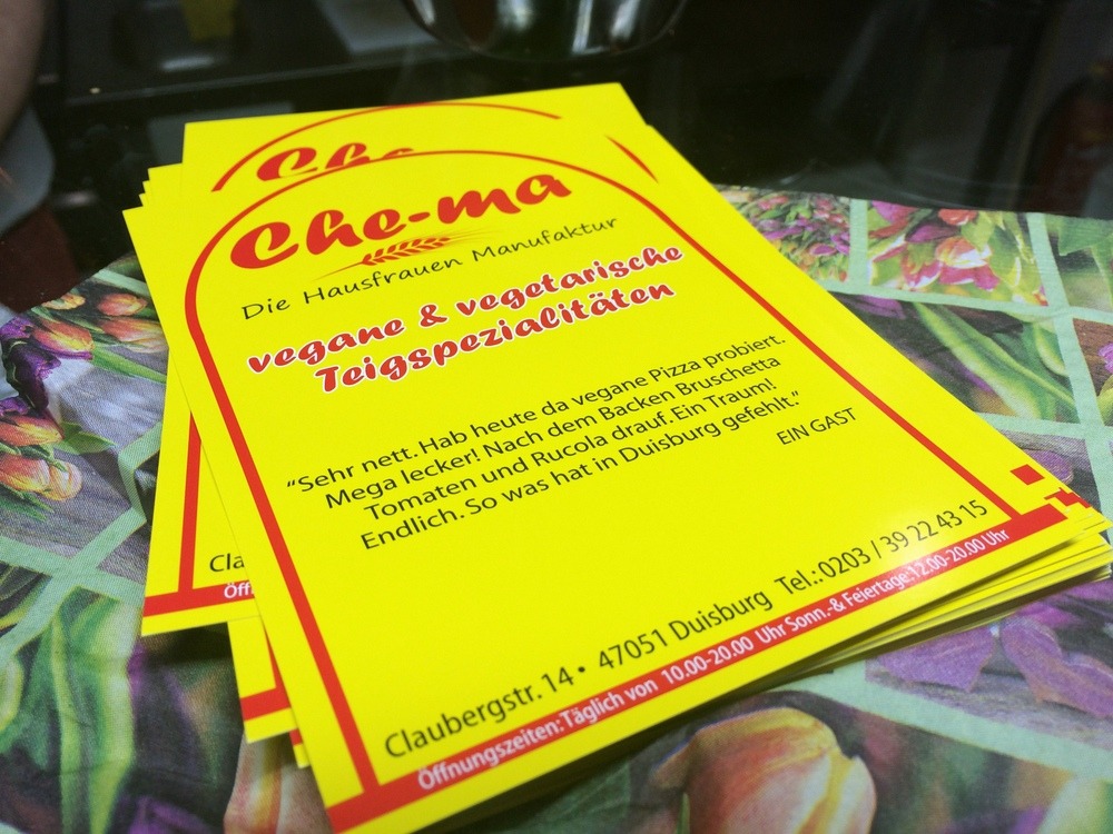 Wer in Duisburg weilt, hat ab sofort eine neue vegane Anlaufstelle. Das Che-ma bietet seit Anfang Januar 2015 vegane Pizza und weitere vegane Gerichte an. Und die Pizza ist RICHTIG gut, aber dazu gleich mehr.
