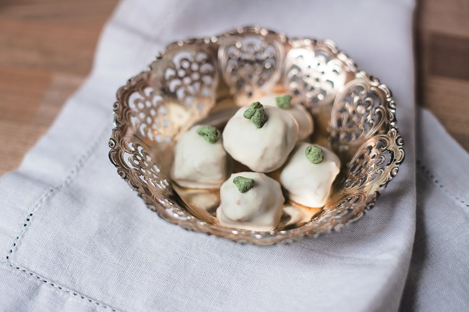 - Basilikum-Matcha in Limettenkuvertüre, mit Soja, Hafer- und Mandelsahne