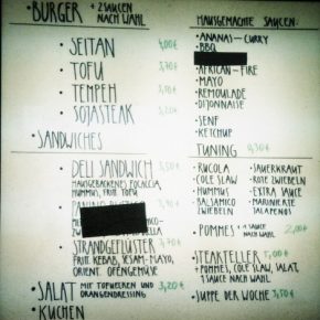 Fangen wir mal mit den Burgern an. Diese kann man sich selber nach Herzenslust zusammenstellen. Zwischen die superleckeren Burgerbrötchenhälften kommt ein Bratling aus wahlweise Seitan, Tempeh, Sojasteak oder Tofu. Dann gibt es Salat, Zwiebeln, Tomaten etc. drüber und man kann anschließend noch aus zwei Dressings wählen. Ich hatte u.a. das BBQ-Dressing, was ich unglaublich gut fand. Überhaupt dürfte das so ziemlich der beste Burger gewesen sein, den ich je gegessen habe. Aber auch die diversen Sandwiches sahen richtig gut aus. Preislich bewegen sich Burger und Sandwiches so zwischen 3,20 und 4 Euro, völlig ok also. Mein Burger war übrigens auch ganz schön mächtig, und reichte mir als alleinige Mahlzeit. Den Rest konnte ich noch nicht probieren, aber das was so über die Theke ging, sah durchweg toll aus. Außerdem wird das Angebot fleißig immer wieder angepasst und ergänzt, z.B. um die “Stars der Woche”.