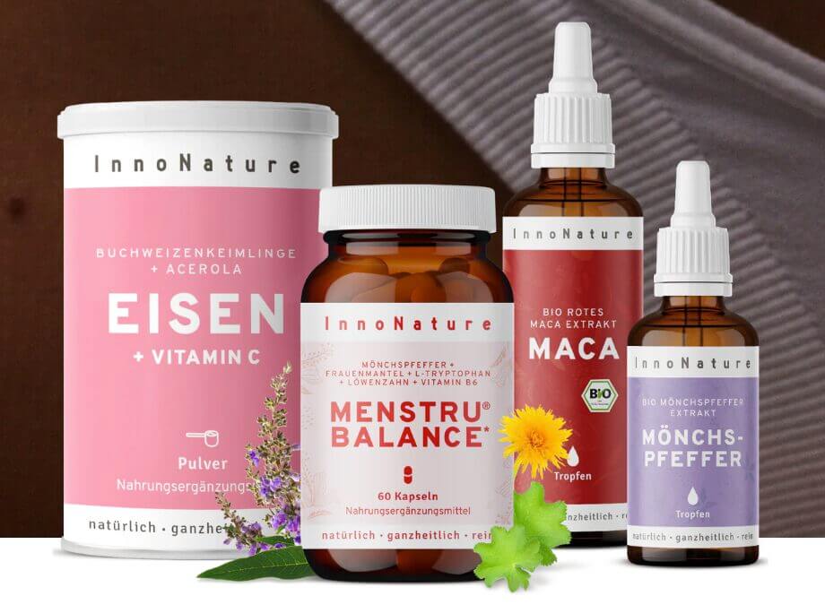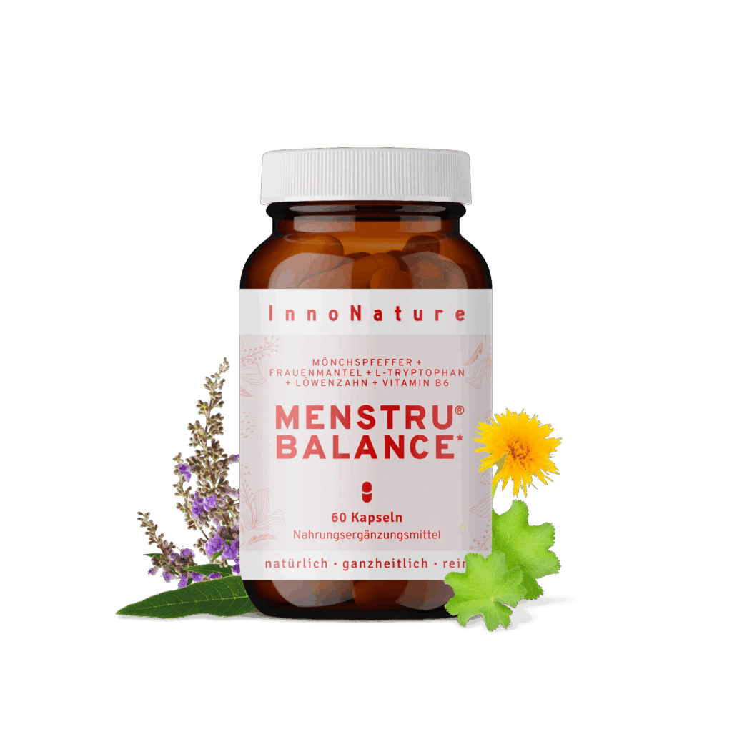Wenn du deinen Zyklus zusätzlich zur Ernährung unterstützen möchtest, könnte ein pflanzliches Supplement interessant sein. Ein Beispiel ist Menstru® Balance von InnoNature*.