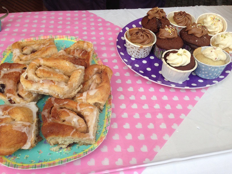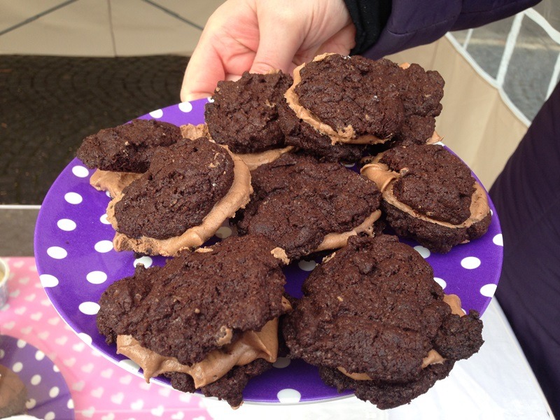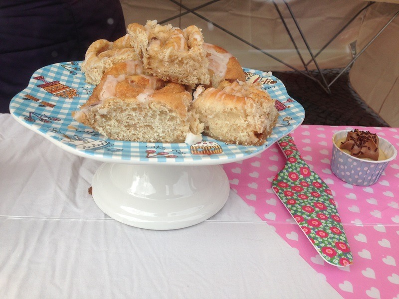 Einen Stand weiter lockt Meike mit ihren veganen Backwaren. Bei den Heidelbergern ist sie bekannt, sie backt zauberhafte vegane Torten und hat einen kleinen veganen Catering-Service mit dem Namen Holy Kitchen. Auf dem Samstagsmarkt verkauft sie süße Teilchen, Kuchen, Törtchen, Kekse – man kann sich nur sehr schwer entscheiden. Ich habe mich mit einer Zimtschnecke und einem Stück Kirsch-Streusel vergnügt und die waren beide wirklich verdammt lecker!