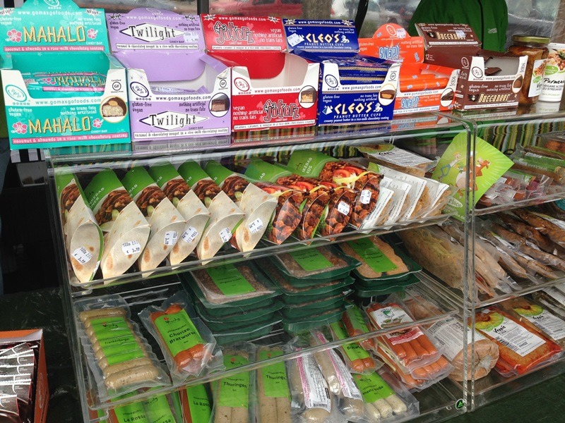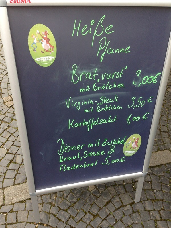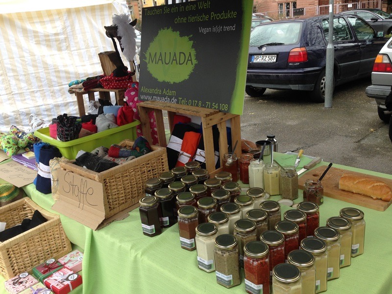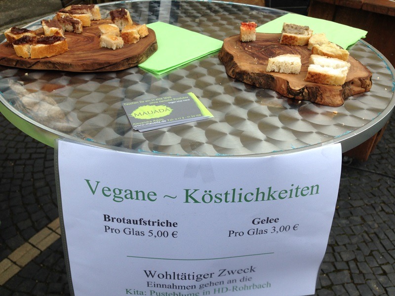 Die Heidelberger haben nun ihren eigenen kleinen VSD jeden Samstag – könnte man meinen ;) In der Weststadt findet jetzt regelmäßig der Samstagsmarkt statt mit vielen veganen (aber nicht nur) Ständen. Da wäre zum einen der Stand von www.your-veggie-place.de, wo es allerlei vegane Produkte zu kaufen gibt, aber auch warme Leckereien wie Bratvurst, Virginia-Steak oder Döner. Und sehr nett bedient wird man auch noch! Ich habe mir jedenfalls meinen Jute-Beutel ordentlich vollgepackt.