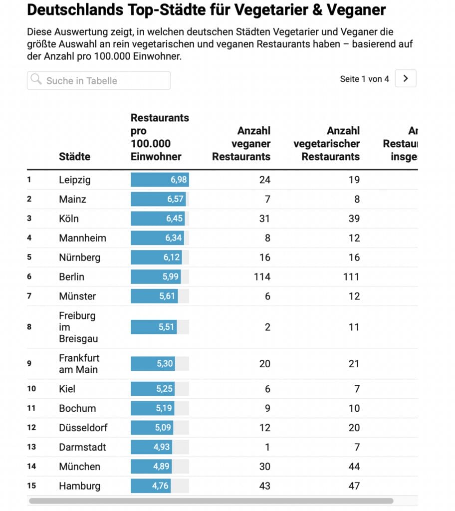 Doch welche Städte in Deutschland bieten die besten Möglichkeiten für eine fleischfreie Ernährung? Um das herauszufinden, hat Holidu eine Analyse durchgeführt und die Anzahl vegetarischer und veganer Restaurants in den Städten ins Verhältnis zur Einwohnerzahl gesetzt. Das Ergebnis ist ein spannendes Ranking der zehn besten Städte für pflanzliche Genießer! Hättet ihr vermutet, dass es in Leipzig über 24 vegane Restaurants gibt? Hier sind die Top 10!