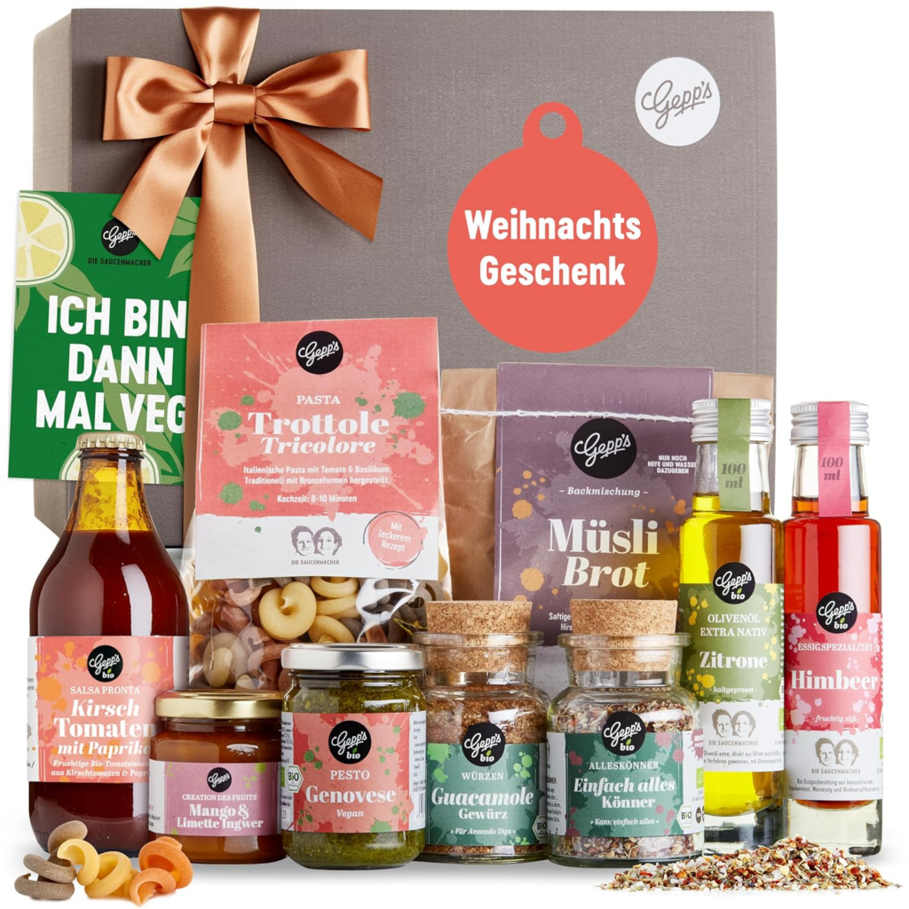 Stelle einen individuellen Geschenkkorb mit einer Auswahl an veganen Leckereien zusammen, darunter Trockenfrüchte, Nüsse, vegane Kekse, Aufstriche und sogar vegane Weine oder Biere. Das Gepp’s Feinkost Vegan Must-Have Set* enthält viele köstliche Variationen an veganen Delikatessen wie Bio Pesto, Aperitif-Essig & Fruchtaufstrich.