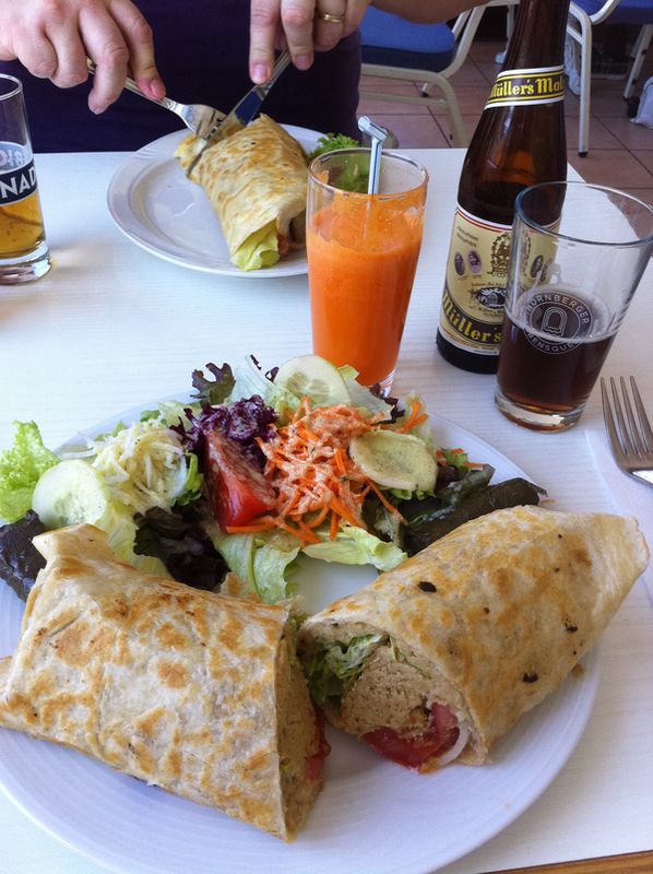 Das Restaurant hat bereits 1994 in Heidelberg eröffnet und bietet seinen Gästen internationale vegetarische Küche. Auf der Karte stehen viele vegane Gerichte, die auch als solche gekennzeichnet sind. Lediglich beim Orient-Wrap ist Vorsicht geboten, dieser wird als vegan bezeichnet, enthält aber Schafskäse. Ich habe mir eben diesen Orient-Wrap bestellt, denn die Kombination aus Falafel, Hummus, Reis, Salat, Tomaten und Gurken in einem Weizenfladen klang für mich sehr interessant. Der Wrap wird mit einem Beilagensalat und Weinblättern serviert.  Ich fand die Zusammenstellung stimmig und megalecker. Dazu gab es einen frisch gepressten Karotten-Apfel-Saft.