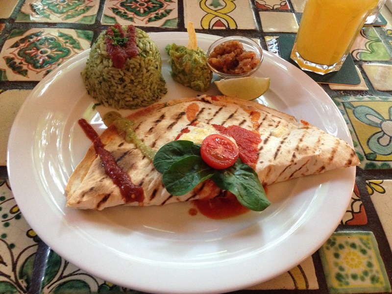 - Quesadilla con frijoles y queso (Weizentortilla mit Bohnenmus und Wilmersburger Pizzaschmelz, dazu grüner Reis und Salsa) – 8,90 €