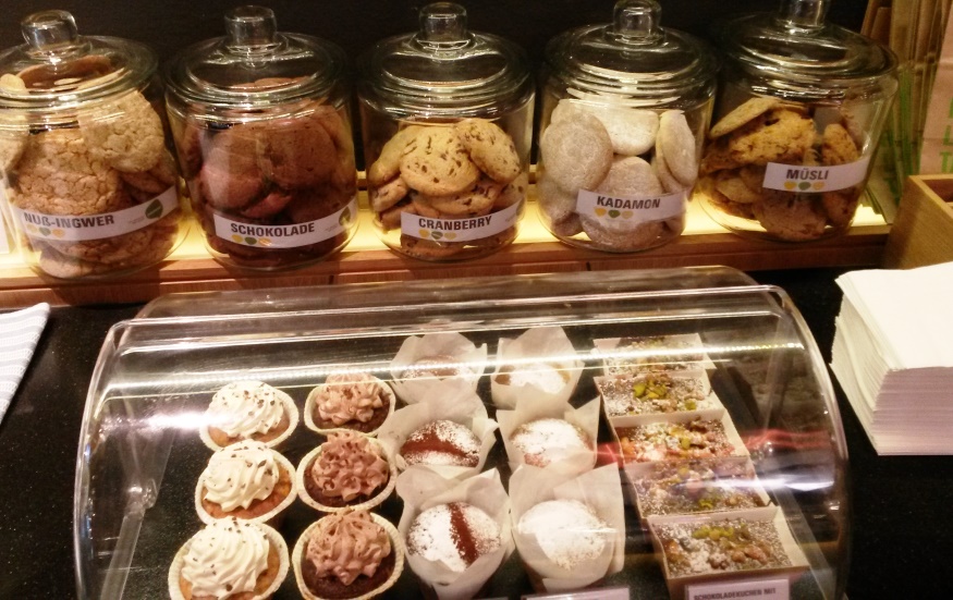 Während Getränke und Desserts an den Platz gebracht werden, muss man die restlichen Speisen nach der Auswahl selbst abwiegen und auf eine Karte buchen, abgerechnet wird dann am Ende. Dieser Kassensturz ist auch der einzige Grund, warum ich nicht noch viel öfters ins Yamm gehe, denn mit einem Preis von 2,70 EUR pro 100g kommt schnell ein beachtlicher Betrag zusammen. Deutlich günstiger fährt man, wenn man zum Frühstücken kommt (bis 11 Uhr), denn dann kosten 100g vom Buffet nur 1,90 EUR – allerdings ist dieses bis dahin noch nicht mit allen Speisen bestückt. Alternativ kann man in den Morgenstunden eine fertige Frühstücksvariation wählen: komplett vegan ist bislang nur das Frühstück „vegan“, aber mit leichten Umbestellungen kann man auch das „OrientOccident“ in einer rein pflanzlichen Variante haben. Da laufend neue Frühstücksgerichte kreiert werden, hoffe ich hier auf baldige neue Ideen seitens der Yamm-Küche.
