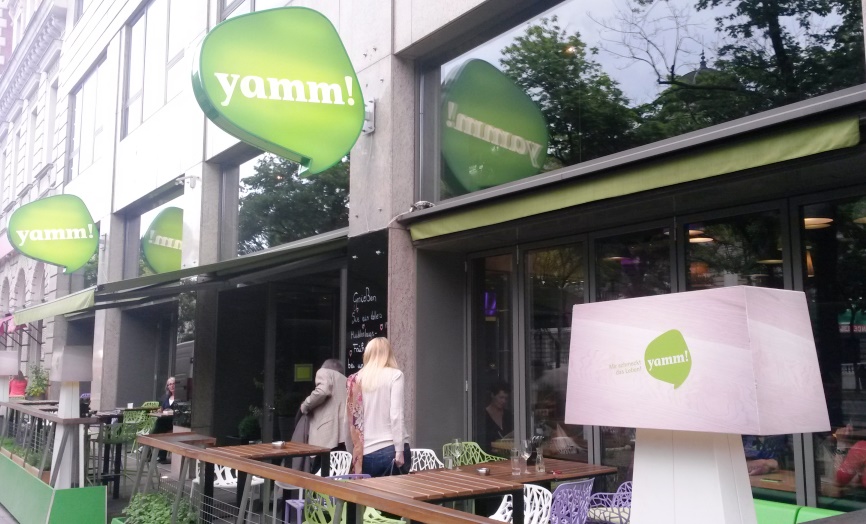 Es wird wirklich höchste Zeit, dass ich über einen Ort berichte, wo man von morgens bis abends in den verschiedensten Variationen speisen kann, wo es sich richtig fein chillen lässt, wo man völlig ungezwungen entscheiden kann, wie viel und wovon man essen möchte, wo es unterschiedliche Sitzbereiche und –ebenen gibt und wo eine große Dessert-Vitrine mein süßes Herz höher schlagen lässt: Heute möchte ich ein bisschen über das Yamm in Wien schwärmen.