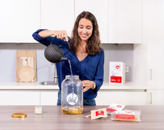 Brew it yourself: Du kannst dir mit fairment auch deinen eigenen Kombucha herstellen. Das Starter Kit enthält alles, was du benötigst – vom Kombucha Pilz (Scoby) über das richtige Gärgefäß sowie das Rezept und einen Online-Zugang zur fairment Online Akademie. fairment regt mit den DIY Kits bewusst dazu an, sich eigene Lebensmittel herzustellen. Somit wird nicht nur die Verpackung gespart, sondern auch der Weg in den Supermarkt. Das wirkt sich positiv auf die Umwelt und den eigenen Geldbeutel aus.