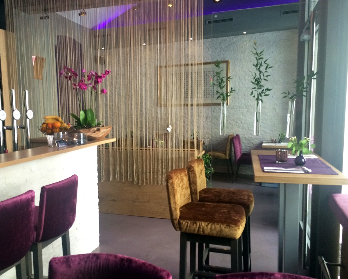 Was das Interieur betrifft, so sind violett und gold die Farben, die das Vlaire Uisine bestimmen – das zieht sich von der Bestuhlung, über Tischläufer und Lampen bis hin zu den Waschbecken in den Toiletten. Die gesamte Einrichtung ist mit Bedacht aufeinander abgestimmt. Dazwischen findet man nicht nur viele passende Deko-Details, sondern auch praktische Dinge wie Zahnseide und Fusselroller in den Waschräumen.