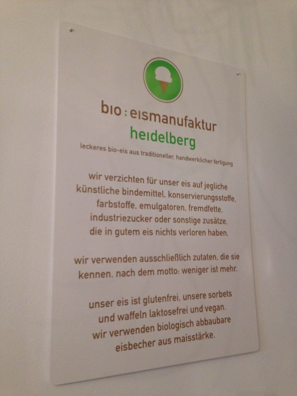 Die Bio-Eismanufaktur hat ganz neu in der Heidelberger Weststadt eröffnet. In unmittelbarer Nähe zum Denns Biomarkt kann man hier nun traditionell hergestelltes Eis aus guten biologischen Zutaten bekommen. Man verzichtet nach eigener Aussage auf jegliche künstliche Bindemittel, Konservierungsstoffe, Farbstoffe, Emulgatoren, Fremdfette, Industriezucker, oder sonstige Zusätze, die in einem guten Eis nichts verloren haben.