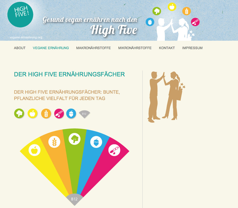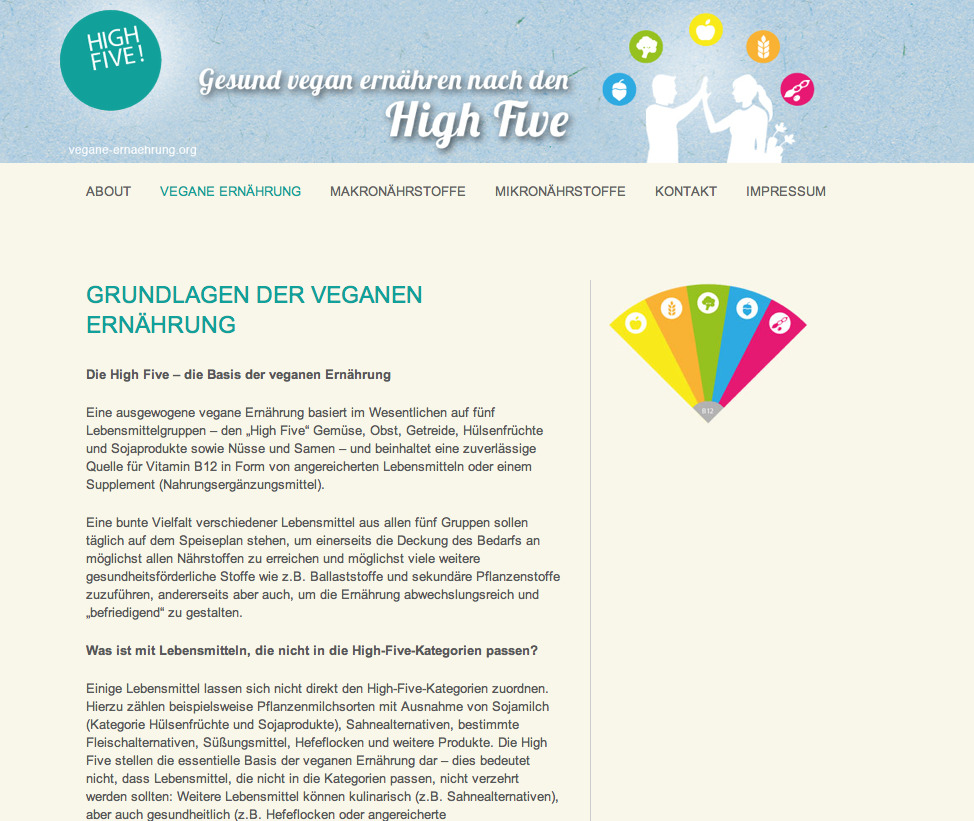 High Five Vegan bietet fundierte, detaillierte und praxisnahe Informationen rund um die vegane Ernährung. Die Schwerpunkte liegen dabei zum Einen auf den bei einer veganen Ernährung potenziell kritischen Nährstoffen und zum Anderen auf dem High Five Ernährungskonzept, welches auf dem Ernährungsfächer mit den fünf Lebensmittelgruppen (= die „High Five“) aufbaut. Zielgruppen sind Interessierte und Einsteiger sowie erfahrene Veganer, die noch die ein oder andere Wissenslücke haben oder sich einfach „up-to-date“ halten möchten, aber ebenso Fachleute wie z. B. Ernährungswissenschaftler, Ernährungsberater oder Mediziner, die sich einen Überblick über das Thema vegane Ernährung verschaffen wollen.