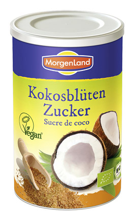 Dieser Kokosblüten-Zucker ist für mich eine feine Alternative – selbst zum Agavendicksaft. Er ist leicht malzig und hat eine dezente Karamell-Note. Laut MorgenLand kann „Kokosblüten-Zucker Haushaltszucker in allen Bereichen (Austausch 1:1) ersetzen und löst sich dank seines niedrigen Schmelzpunktes sehr gut in kalten Speisen und Getränken. Zudem ist er ideal zum Backen, bringt Struktur ins Gebäck und verstärkt das Eigenaroma.“