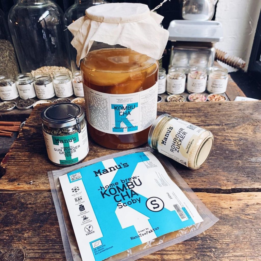 Die ManuTeeFaktur ist eine Berliner-Kombucha-Brauerei. Du findest dort aber auch Matcha und andere Teesorten. Die Produkte enthalten ausschließlich vegane und organische Zutaten und sind ebenfalls umpasteurisiert. “Manu’s Home Brew” ist der Powerdrink mit lebendigen Mikrooganismen für dein erfrischend gutes Bauchgefühl und ist in den Sorten “Matcha”, “Mint”, “Ginger” und “Pure” erhältlich. Alle Zutaten stammen aus 100% biologischem und nachhaltigem Anbau. Die Produkte der ManuTeeFaktur kannst du beispielsweise bei Alnatura oder online im Shop kaufen.