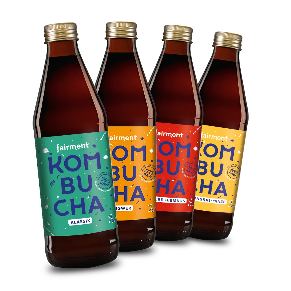 Das Berliner Unternehmen fairment* steht für “fair” und “Fermentierung” und verkauft umpasteurisierte Kombuchasorten, sowie andere fermentierte Produkte wie Kefir oder Joghurt. Kombucha kannst du dort in den Sorten “Klassik”, “Ingwer”, “Himbeere-Hibiskus” und Lemongras” kaufen. Außerdem bietet Fairment mehrere Kits und verschiedene Zubehör an, um beispielsweise Kombucha, Kefir, Sauerteig oder Joghurt selber herzustellen. Alle Produkte sind bio-zertifiziert und außerdem setzt sich Fairment im sozialen Bereich ein.