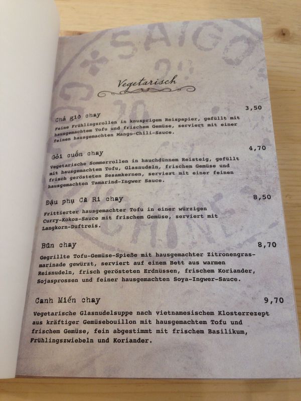 Das Mémoires d’Indochine hat eine kleine vegetarische Karte. Leider enthalten sowohl die Frühlingsrollen als auch die Sommerrollen Ei. Und bei dem frittierte Tofu in Curry-Kokos-Sauce ist Sahne in der Sauce. Die gute Nachricht ist aber: die Bedienung kennt sich damit aus und weiß, was vegan bedeutet und welche Zutaten wo drin sind.