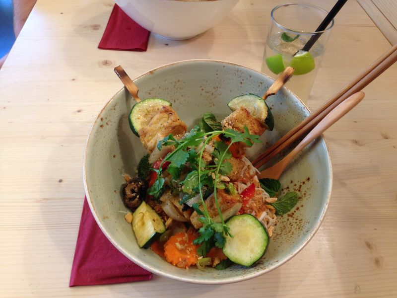Die Tofu-Gemüse-Spieße habe ich probiert und war sehr positiv überrascht. Für einen Imbiss ist das Geschirr wirklich total schön und das Essen war megalecker. Dazu gab es ein selbstgemachtes Limetten-Ingwer-Soda. Der Paradeplatz und somit die Mannheimer Innenstadt sind in Gehweite, darum werden wir dort mit Sicherheit nochmal hingehen und auch die Glasnudelsuppe versuchen. Schaut Ihr doch auch mal vorbei!