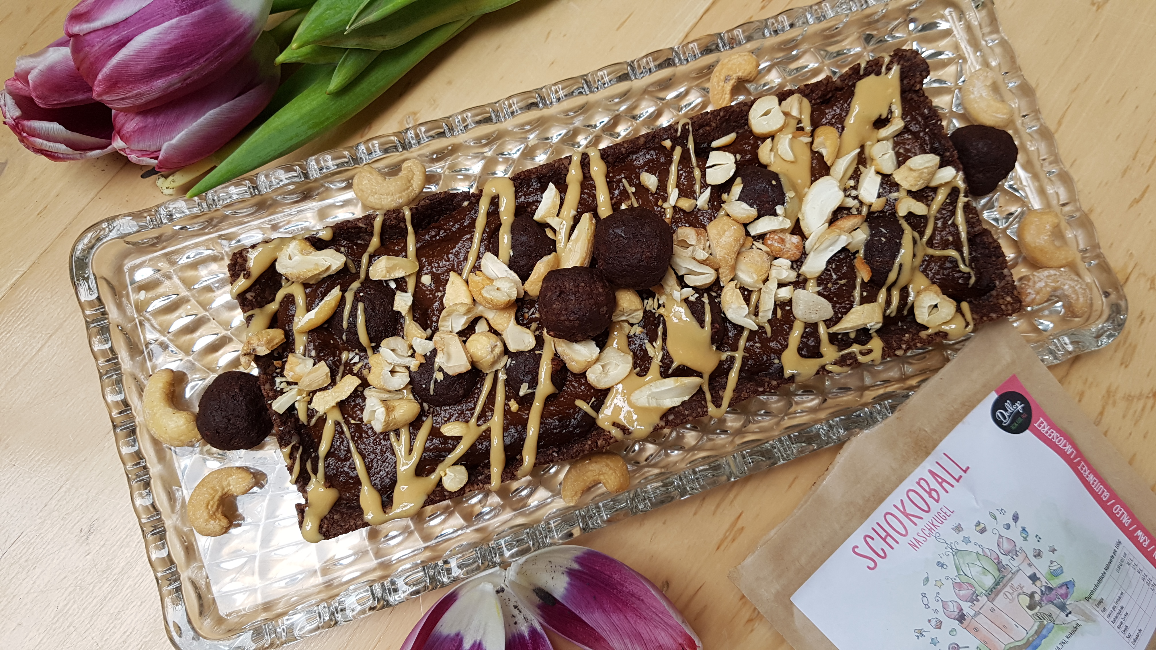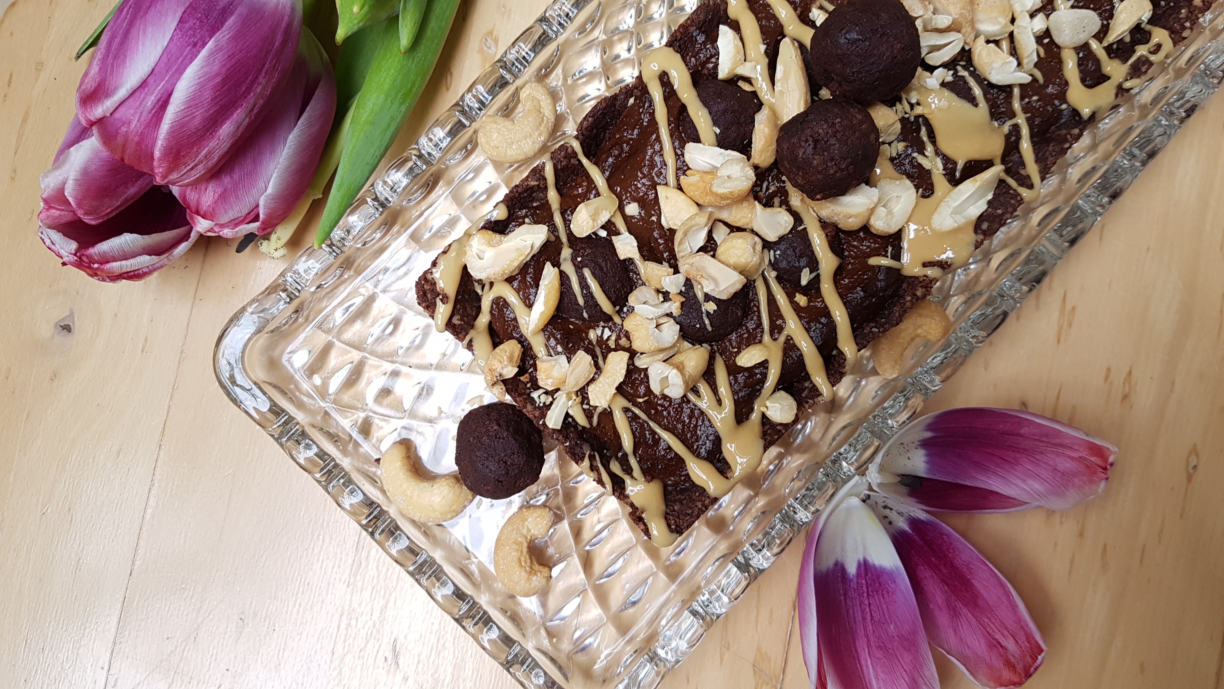 Mousse au Chocolat-Tarte mit Schokoballs, Erdnussmus und gesalzenen Cashews
