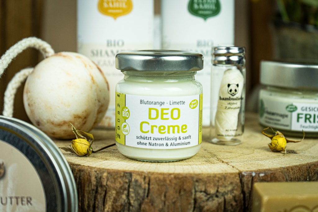 Die handgemachte Kräutermagie Deo-Creme Salbei-Orange ist natronfrei und im Glastiegel verpackt. Das Deo schützt langanhaltend vor Körpergeruch, enthält weder Aluminium, Alkohol, Konservierungsmittel, noch Parabene, Silikone oder Erdölderivate. Die hochwertigen Öle pflegen deine Haut auf ganz natürliche Weise. Das Deo hinterlässt keine Spuren auf der Kleidung und ist auch direkt nach der Rasur verwendbar. Natürlich ist das Deo tierversuchsfrei, vegan und biologisch abbaubar. Es kostet derzeit 9,26€. Es gibt noch die Sorte Blutorange und eine ganz tolle Gesichtscreme ohne Aluminium, Alkohol und Konservierungsmittel.