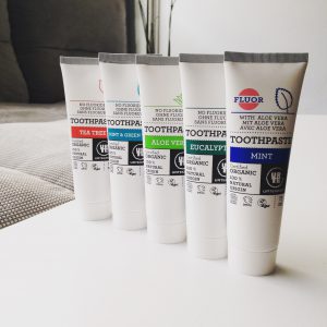 Eine tatsächliche Neuheit für uns war die Zahnpasta von Urtekam einem dänischen Kosmetik Unternehmen. Geschmacksrichtungen wie Minze & Grüner Tee oder Teebaumöl kannten wir jedenfalls bisher noch nicht. Die Zahncremes enthalten zu einem großen Teil biologische Zutaten und kommen bis auf eine Sorte alle ohne Fluor aus.