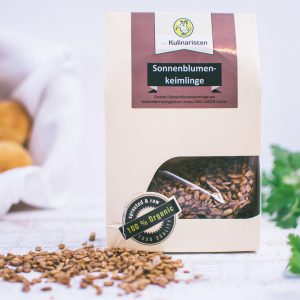 Wir haben noch diese super leckeren Sonnenblumen-Keimling aus der WholeFoodBox bei uns im Schrank gefunden und knabbern jetzt erst mal ein bisschen. Gekeimt schmecken die noch besser als normale geröstete.