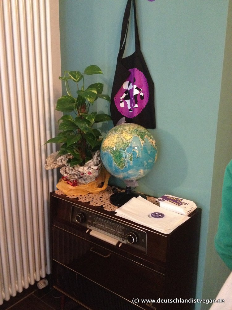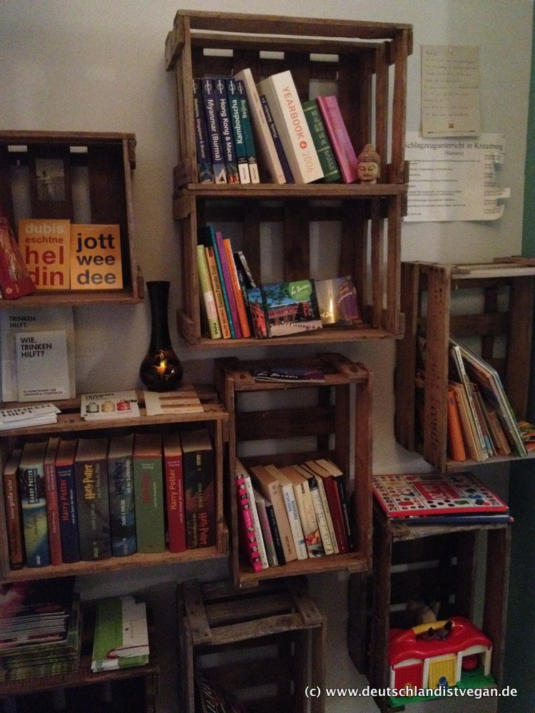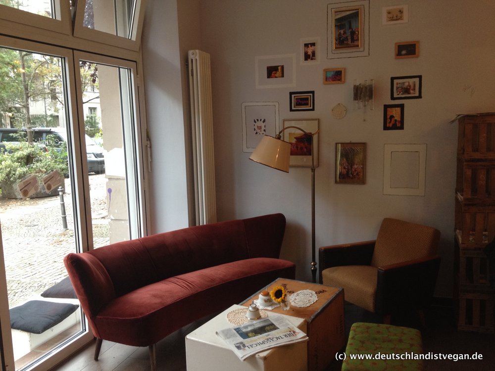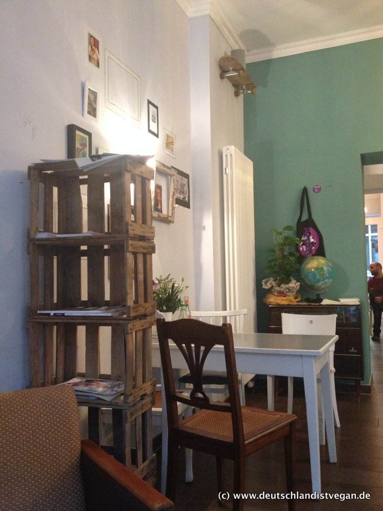 Angefangen beim liebevoll gestalteten Ambiente des recht großen Cafés mit zwei Räumen. Hier hat sich die Betreiberin und ihre Mitstreiter wirklich Mühe gegeben, man kann sich kaum satt sehen an all den tollen Ideen und Möbeln und Kleinigkeiten, die das Café zu bieten hat. Ein superschöner Mix aus vor allem 60er Jahre Möbeln und Selbstgebasteltem. Und wer dann doch genug geguckt hat, für den ist für ausreichend Lesestoff gesorgt, es gibt sogar ein Bücherregal. Ich finde das Café wirklich supergemütlich, es gibt W-Lan, und man möchte eigentlich gar nicht mehr aufstehen, sondern den Tag dort vertrödeln. Die Betreiberin und ihre Angestellten sind dazu auch noch höchst sympathisch.