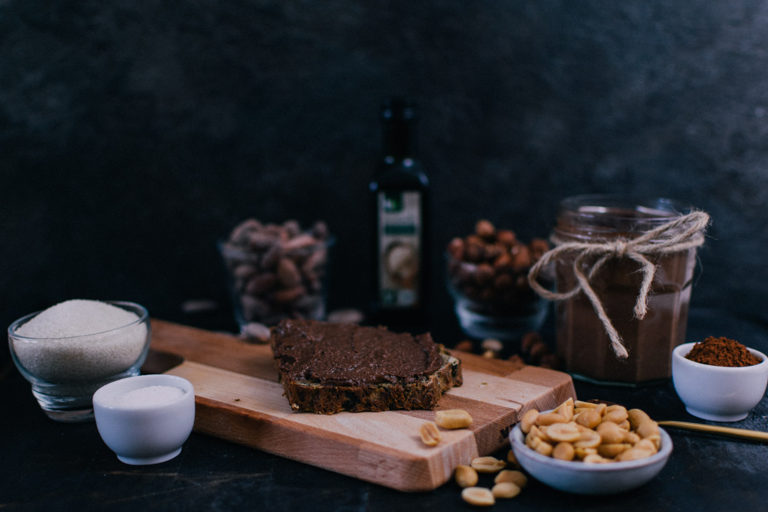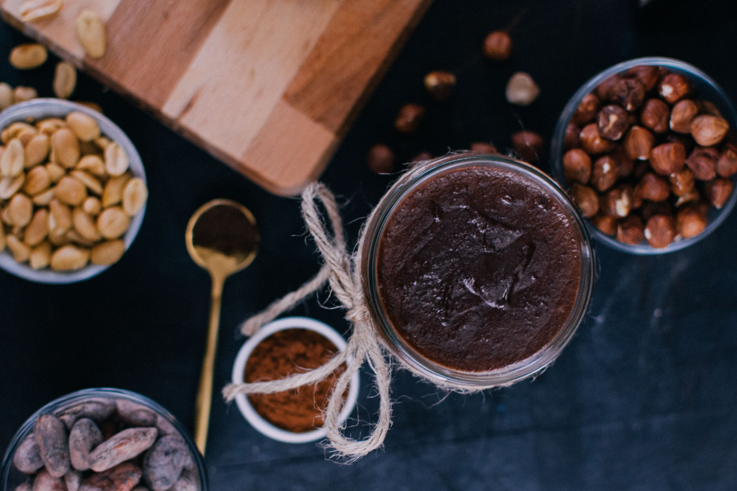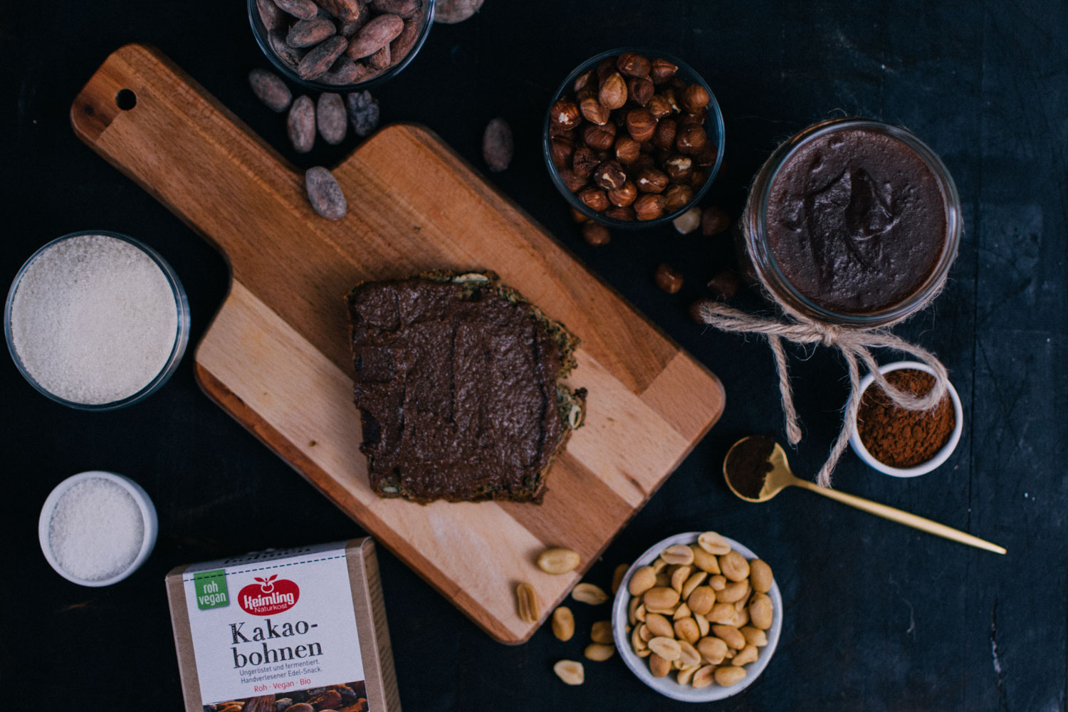 50 g Erdnüsse 85 g Haselnüsse 50 g Rohrohrzucker 200 ml Wasser 1/2 TL Vanille 1 Prise Salz 90 ml Sesamöl 40g Kakaobohnen 2 TL Kakaopulver