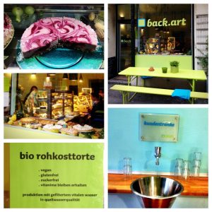 Zwar ist nicht alles hier vegan, dennoch bietet das Cafe jeden Tag ein neues, breit gefächertes Angebot und legt großen Wert auf Bioprodukte und Nachhaltigkeit. Hier gibt es LemonAid, Viva con Aqua oder Pago Säfte, Dinkel- oder Fruchtgetreidekaffee, sowie eine charmant angebrachte “Kundentränke” für Durstige – natürlich for free. Besonders hervorzuheben ist die Auswahl an Bio-Broten, Bagels oder Croissants – diese ist einfach riesig. Ein ähnliches Angebot habe ich selten gesehen. Drei Brote sind immer vegan und auch deklariert: das französische Landbrot, Roggensonne und das Kürbiskornbrot. Die Preise sind absolut moderat (z.B. kostete mich ein Stück der köstlichen Bio-Raw-Cheesecake Himbeer 3,80€) und das Personal immer sehr freundlich. Hier kann man sich absolut wohl fühlen!