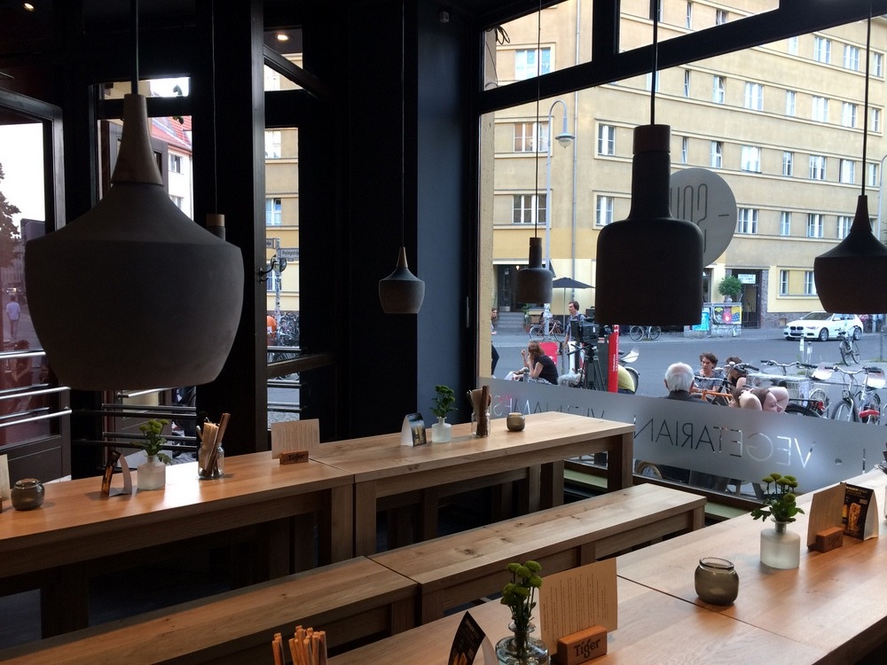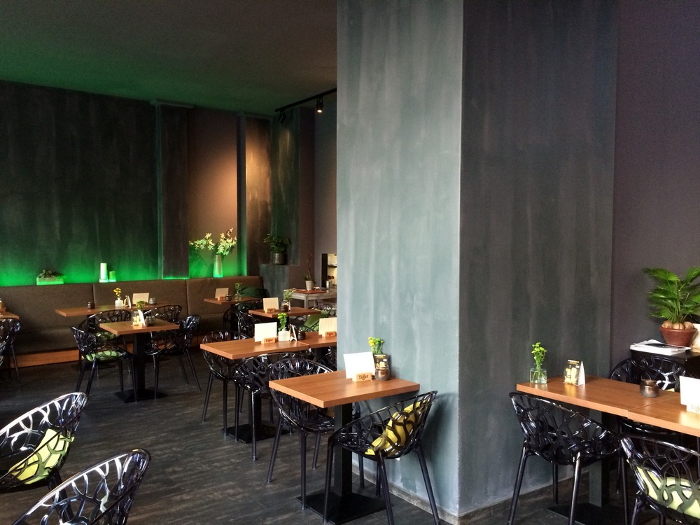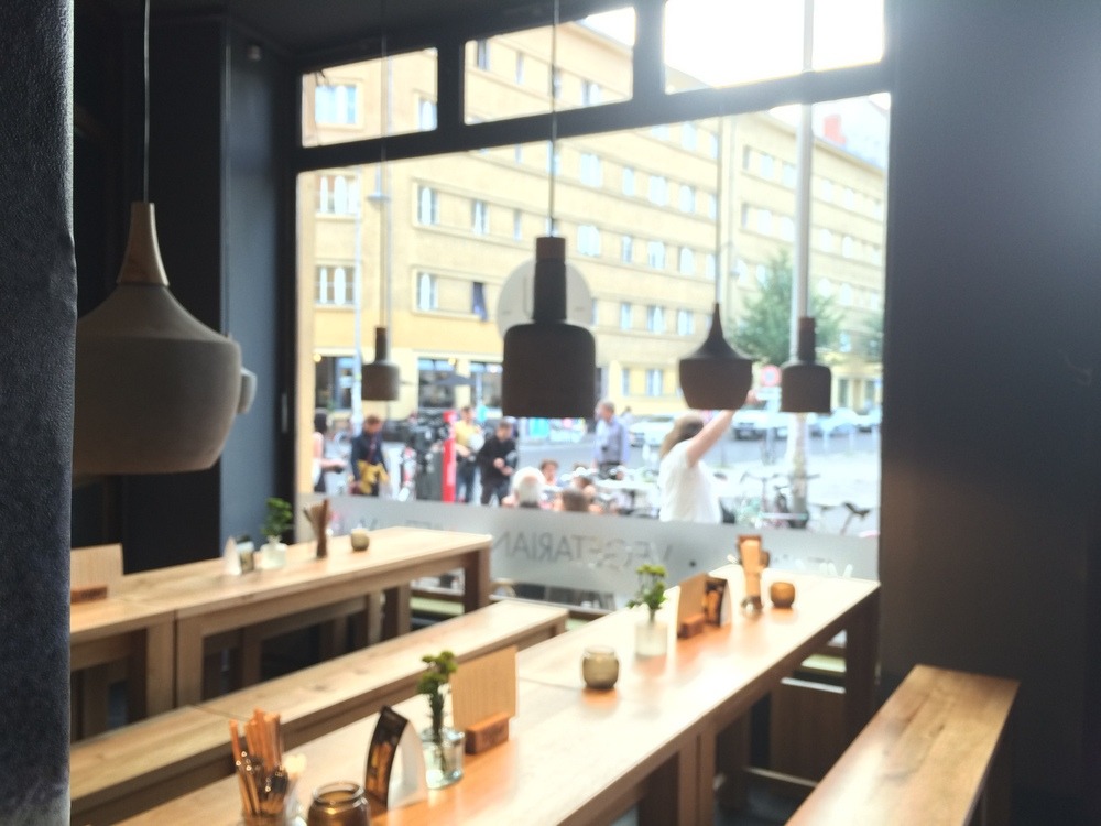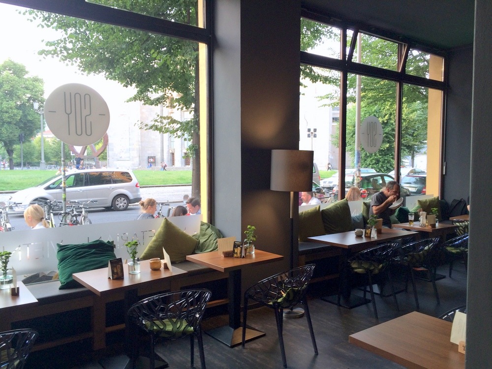 Das Soy ist am Rosa-Luxemburg-Platz, direkt gebenüber der Volksbühne und neben dem Kino Babylon schon mal hervorragend gelegen. Vor allem aber ist es wirklich groß und total schön unkitschig, aber stylish eingerichet. Es gibt eine ganze Menge Sitzplätze drinnen – entweder auf gemütlichen Stühlen oder auf hohen Bänken – und auch draußen. Demnächst sollen draußen sogar noch mehr Plätze angeboten werden, die Beantragung läuft gerade. Auf jeden Fall ist das Soy wirklich schon mal sehr einladend, und bietet richtig viele Plätze für jede Gelegenheit.