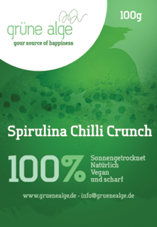 Das schreiben die Betreiber von Grüne Alge zum Thema Spirulina. Die von Grüne Alge angebotenen Spirulina-Produkte kann man in den Varianten „Spirulina Crunchy Flakes“, „Spirulina Chilli Crunch“ und „Spirulina Pulver“ erstehen. Ich kannte Spirulina bislang nur in Tablettenform, fand das daher ganz interessant, in welchen Variationen man das ganze außerdem findet.