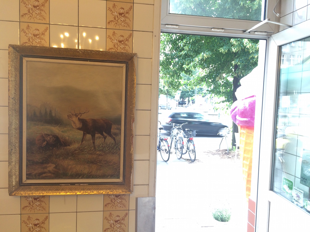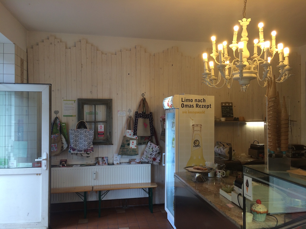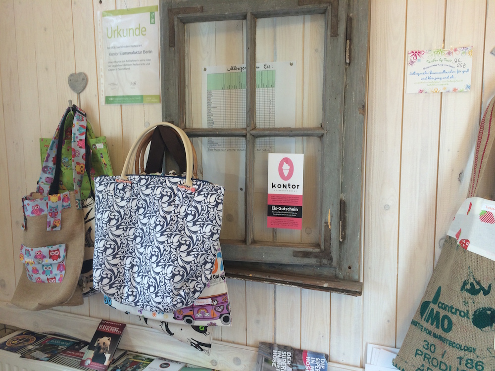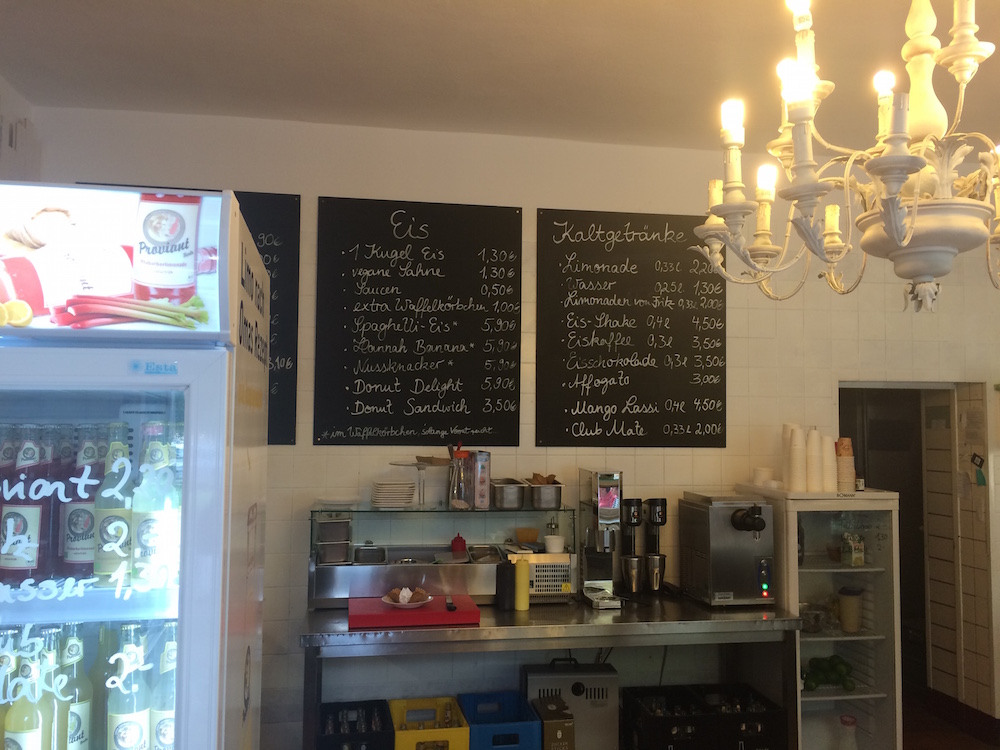 Betreiberin Susanne hat aus der Provinz den Schritt nach Berlin gemacht, und war bereits vorher Eisdielenbesitzerin – nur eben nicht 100% vegan. Sie lebt aber vegan, und wollte natürlich am liebsten eine rein vegane Eisdiele betreiben. Wo, wenn nicht in Berlin, hat sie sich gedacht. Recht hat sie! Dass das Konzept hier funktioniert, zeigt der begeisterte Ansturm auf „The vegan Choice“ seit Eröffnung. Und das zu Recht, denn Susanne macht wirklich geniales Eis mit ungewöhnlichen Sorten und ganz viel Abwechslung. Sie verwendet ausschließlich natürliche Zutaten, möglichst in Bio-Qualität – das schmeckt man! Endlich mal wieder Malaga-Eis essen! Doch nicht nur solche Klassiker sondern auch in meinen Ohren gewagte Eigenkreationen wie Stachelbeer-Moringa, die richtig lecker war, bietet Susanne an. Interessant ist, dass sie gar nicht so gerne Sojadrink als Grundlage verwendet, sondern viel lieber Hafer-, Reis- oder Kokosmilch, auch bei der Schlagsahne kommt kein Soja rein. Man muss einfach unheimlich viel rumexperimentieren, bis man herausfindet, welche Kombination am besten funktioniert, berichtete mir die total sympathische Susanne.
