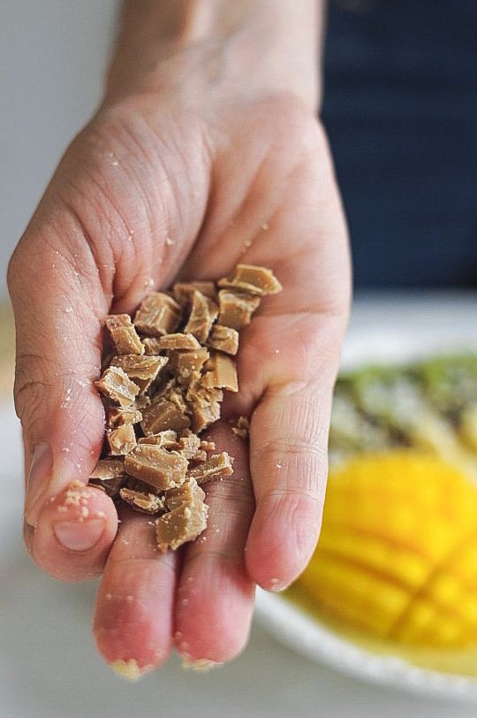 Eine vegane Schokolade, die goldig schimmert und einfach himmlisch schmeckt. Die weiße Schokolade wird aus Mandelmus hergestellt und mit Kokosblütenzucker verfeinert, denn so erhält sie ihre goldene Farbe und eine leichte karamellige Note. Sie passt einfach perfekt zu unserer tropischen Smoothie Bowl, aber natürlich naschen wir sie auch einfach so!