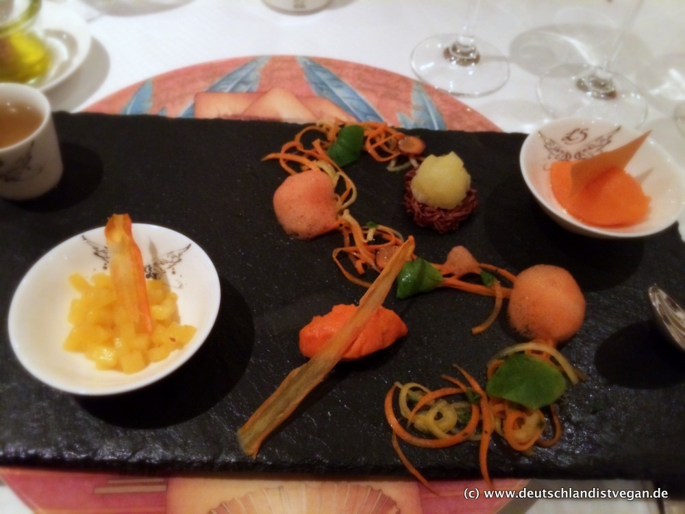 Der Gruß aus der Küche lies schon erahnen, wohin in den folgenden Stunden die kulinarische Reise gehen würde. Die Kombination an unterschiedlichen Komponenten war faszinierend, bis hin zum Schaum aus Möhren. Die Hauptspeise, die in erster Linie aus diversen Gemüsesorten bestand, war unglaublich toll zubereitet, dazu gab es in Tempura-Teig frittierte Pilze. Absolut großartig! Auch die Nachspeise war ein Erlebnis, das ich in Worten tatsächlich schlecht beschreiben kann, daher lasse ich an dieser Stelle lieber ein paar Bilder sprechen: