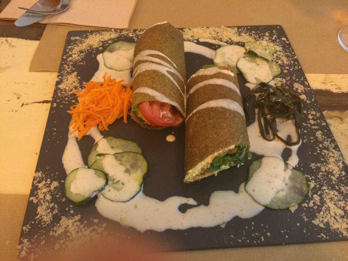 Recht neu am Start ist das „Rizoma“, nicht weit von der Sagrada Familia entfernt. 100% vegan und großartiges Essen, gekocht von einem Star in der spanischen Veganszene, wie man uns gesagt hat. Ein kleiner Laden, der sich kurz nach der Öffnung am Abend (mittags kann man hier aber auch essen) schnell füllt, von daher am besten früh hin. Das Ambiente ist nicht unbedingt sonderlich schön, aber das Essen entschädigt dafür. Sehr schön präsentiertes, wahnsinnig leckeres veganes Essen.