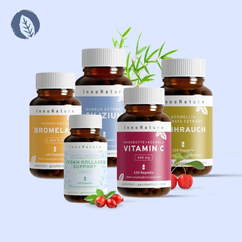 Die Inhaltsstoffe sowie Verzehrempfehlungen der einzelnen Produkte findest Du auf den Etiketten und auf der jeweiligen Produktseite bei uns im Shop: Vegan Kollagen SupportWeihrauchVitamin CSilizium und Bromelain.
