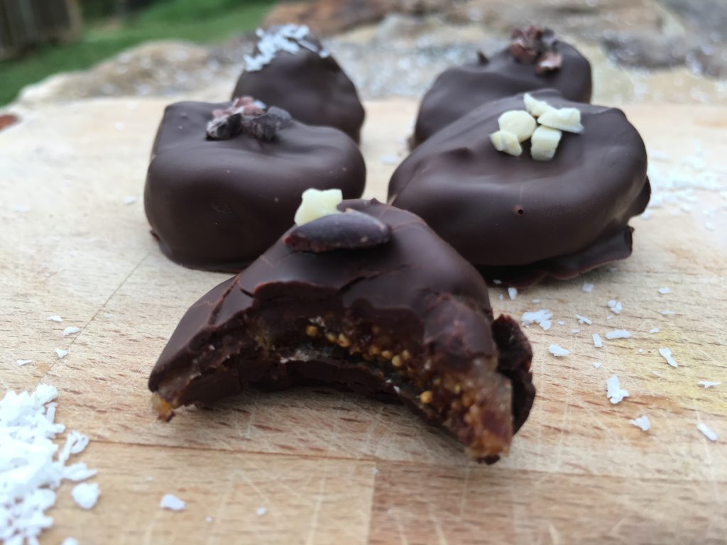 - Die getrockneten Feigen in der geschmolzenen Schokoladenmasse eintauchen und mit Kakao Nibs, gehakten Mandeln oder nach Belieben dekorieren.