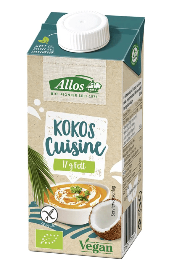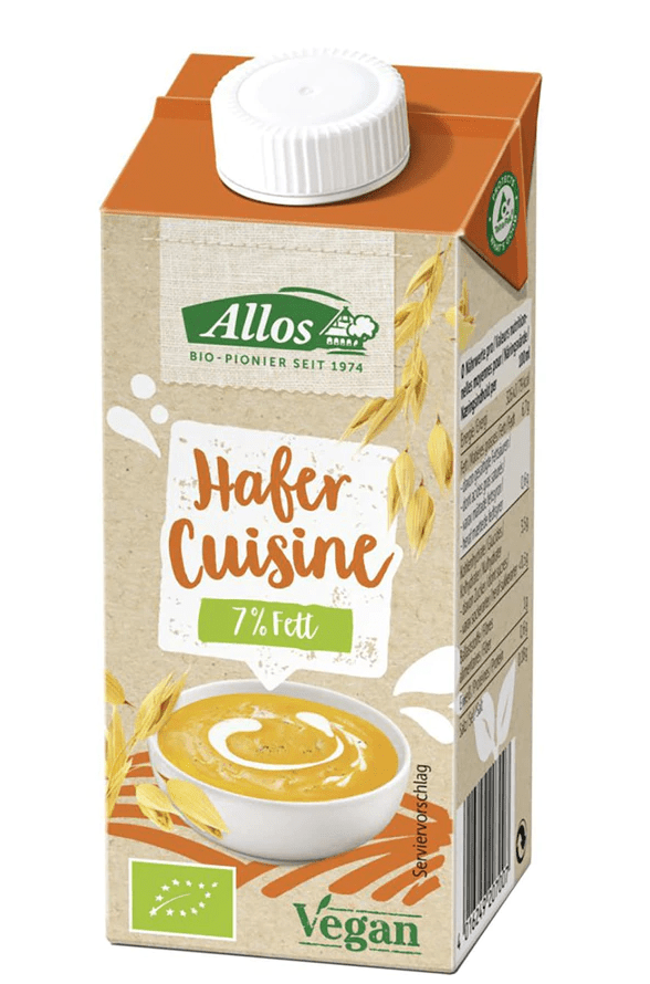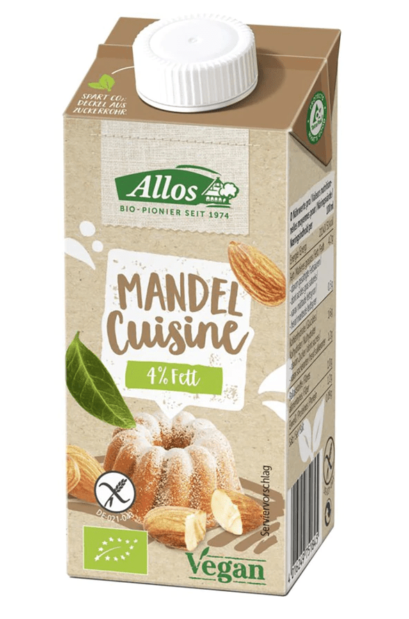 Auch die Marke Allos bietet leckere vegane Sahnealternativen an, und zwar in den Sorten Gratin, Hafer, Kokos, Mandel und Soja. Dabei eignet sich die Mandelvariante perfekt zum Backen und für süße Speisen, alle anderen sind für herzhafte Speisen gedacht. Die Produkte sind alle biozertifiziert. 200ml kosten zwischen 1,79€ und 2,19€.