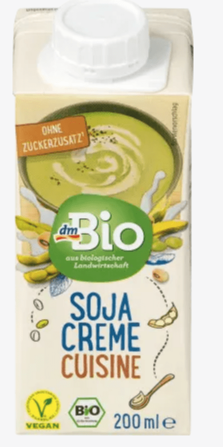 Auch bei dm findest du leckere Sahnealternativen. Die Sojacreme Cuisine und die Hafercreme Cuisine sind beide biozertifiziert und für herzhafte Speisen geeignet. 200 ml kosten 95 Cent.