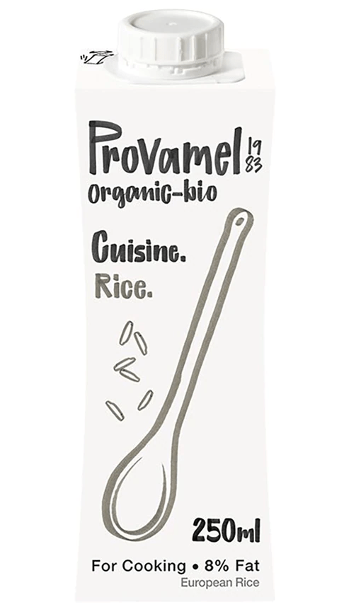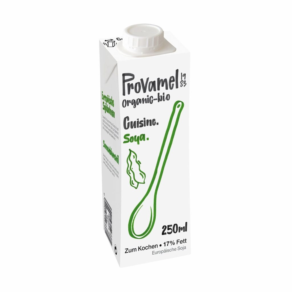 Provamel ist eine bekannte Marke für vegane Milchalternativen in Bioqualität. Natürlich haben sie auch Sahnealternativen in ihrem Sortiment, nämlich in den Varianten Soja und Reis. Dabei unterscheiden die beiden Alternativen sich hauptsächlich im Fettgehalt. Beide sind für herzhafte Speisen geeignet und die Soja-Variante lässt sich sogar aufschlagen und auch für süße Speisen nutzen. 250ml kosten zwischen 1,19€ und 1,49€.